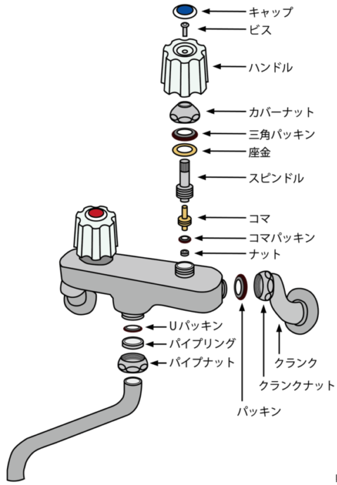 下記みたいなタイプなら 三角パッキン コマパッキン Uパッキンを交換することを